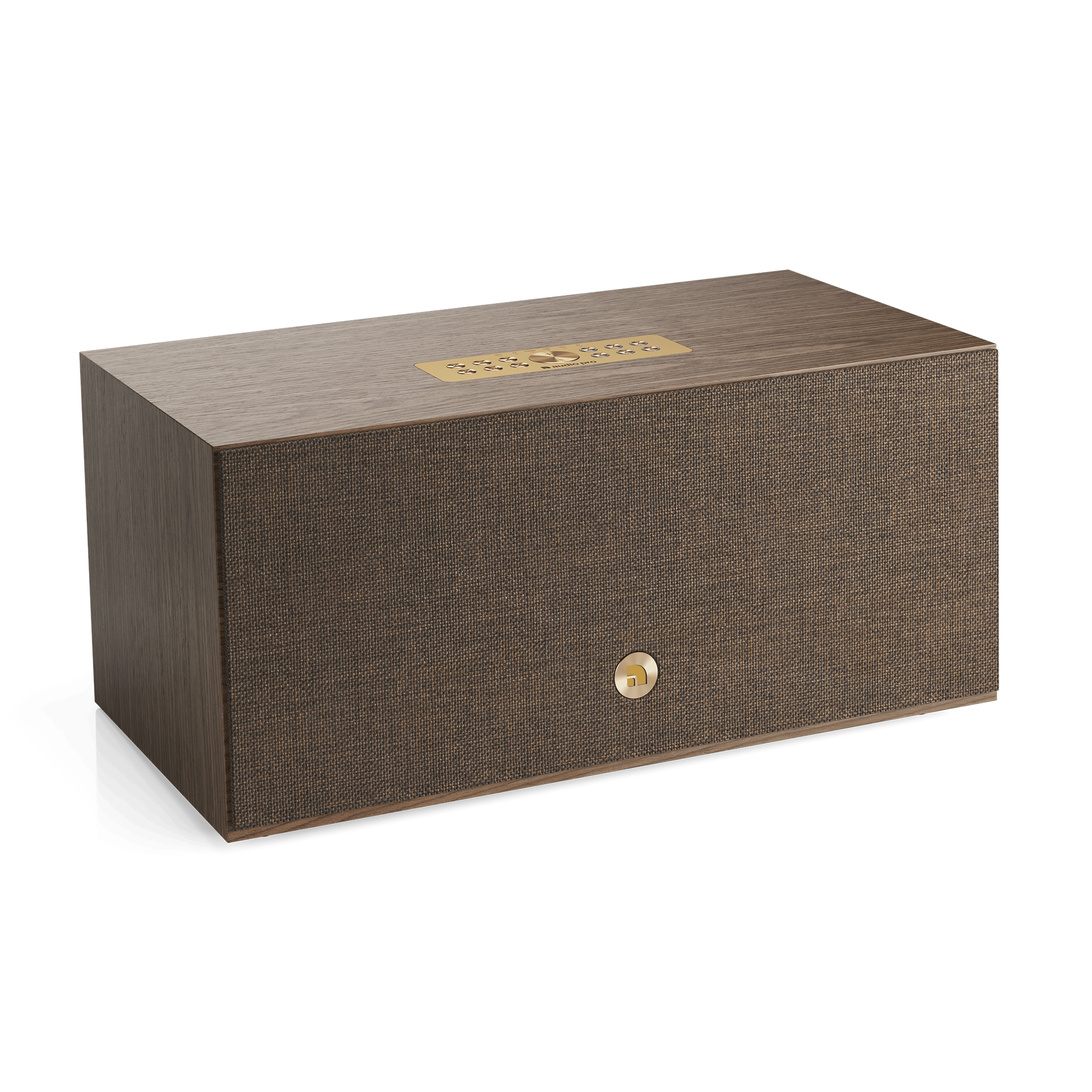 Das stabile Holzgehäuse ist in satiniertem Weiß, elegantem Grau oder klassischem Schwarz erhältlich. Die stoffbezogene Front wird magnetisch gehalten und kann bei Bedarf abgenommen werden – für einen moderneren, puristischeren Look.