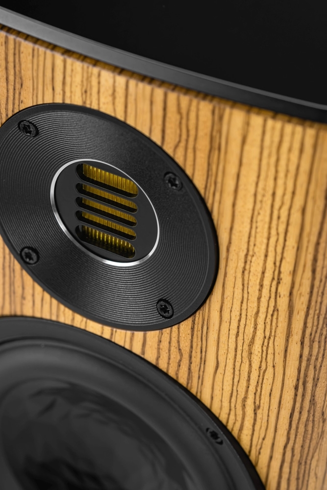 Ihr Design ist augenfällig: hochwertig lackierte oder furnierte Gehäuse, trapezförmig und nach hinten geneigt, treffen auf Aluminium. Große Radien an den Gehäusekanten und die konvex geformte Schallwand fangen das Umgebungslicht und erschaffen optische Tiefe.