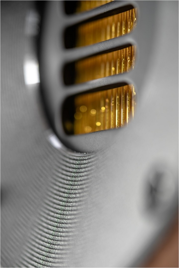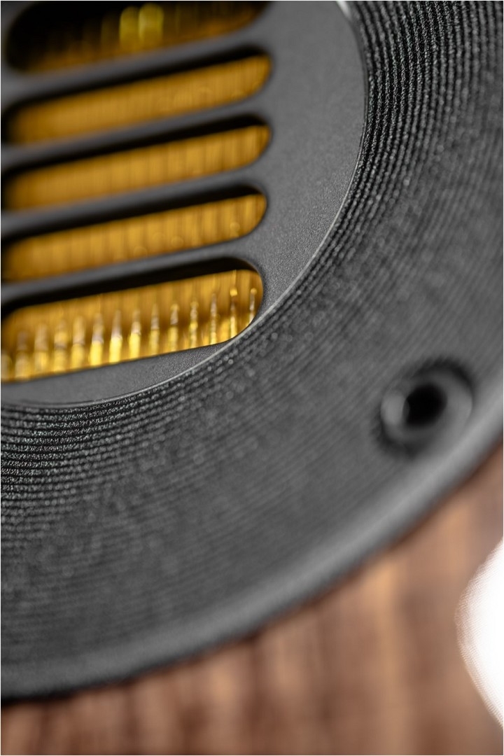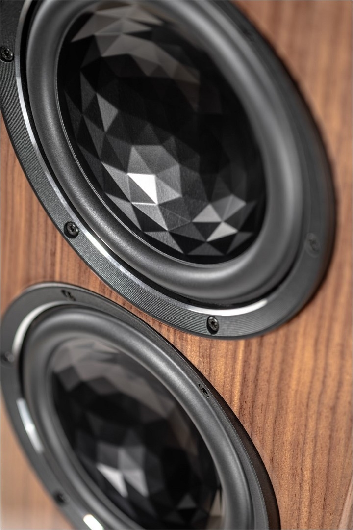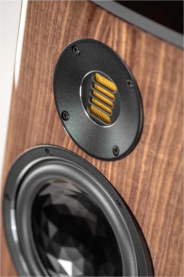 Ihr Design ist augenfällig: hochwertig lackierte oder furnierte Gehäuse, trapezförmig und nach hinten geneigt, treffen auf Aluminium. Große Radien an den Gehäusekanten und die konvex geformte Schallwand fangen das Umgebungslicht und erschaffen optische Tiefe.