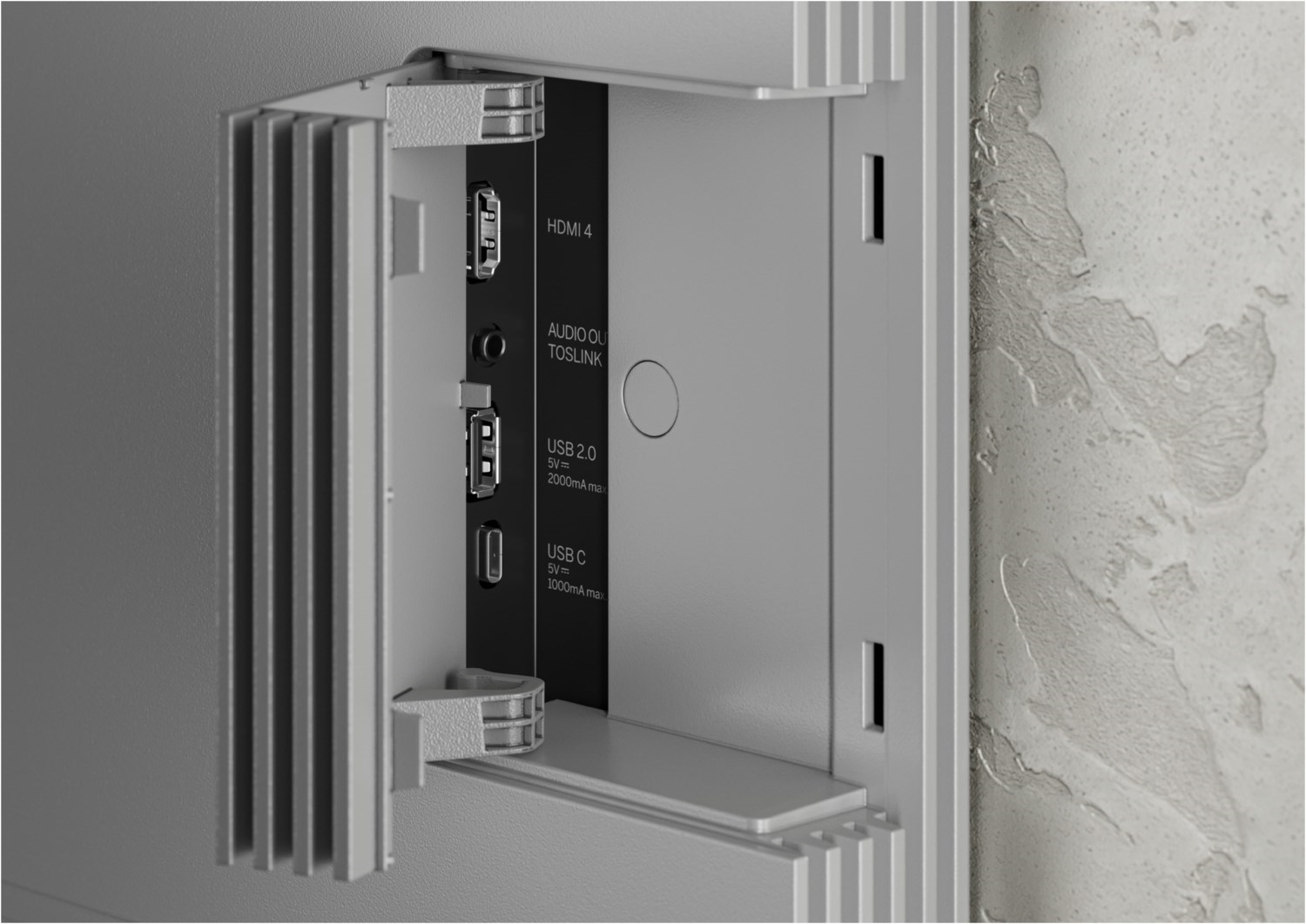 Alle Anschlüsse sind verdeckt, alle Kabel durch das integrierte Kabelmanagement plus Cover in der hellgrauen Rückwand geführt und versteckt. Solide VESA-Dome erlauben eine Wandmontage.
