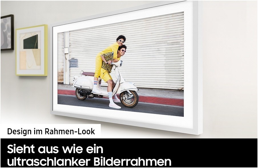 Dank seines Designs im Rahmen-Look sieht der Samsung The Frame Lifestyle Fernseher wie ein ultraschlanker Bilderrahmen aus, der fast lückenlos an deiner Wand hängt und so deine Inneneinrichtung ergänzt. Du kannst den Samsung The Frame 2023 4K TV auch mit separat erhältlichen austauschbaren Rahmen ganz einfach an deinen individuellen Stil anpassen.