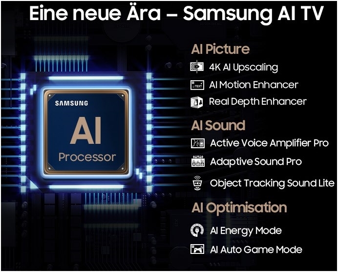 - Der Neural Quantum 4K AI Gen2 Prozessor des Samsung Fernsehers sorgt mit AI und 20 neuronalen Netzwerken für ein atemberaubendes Seherlebnis