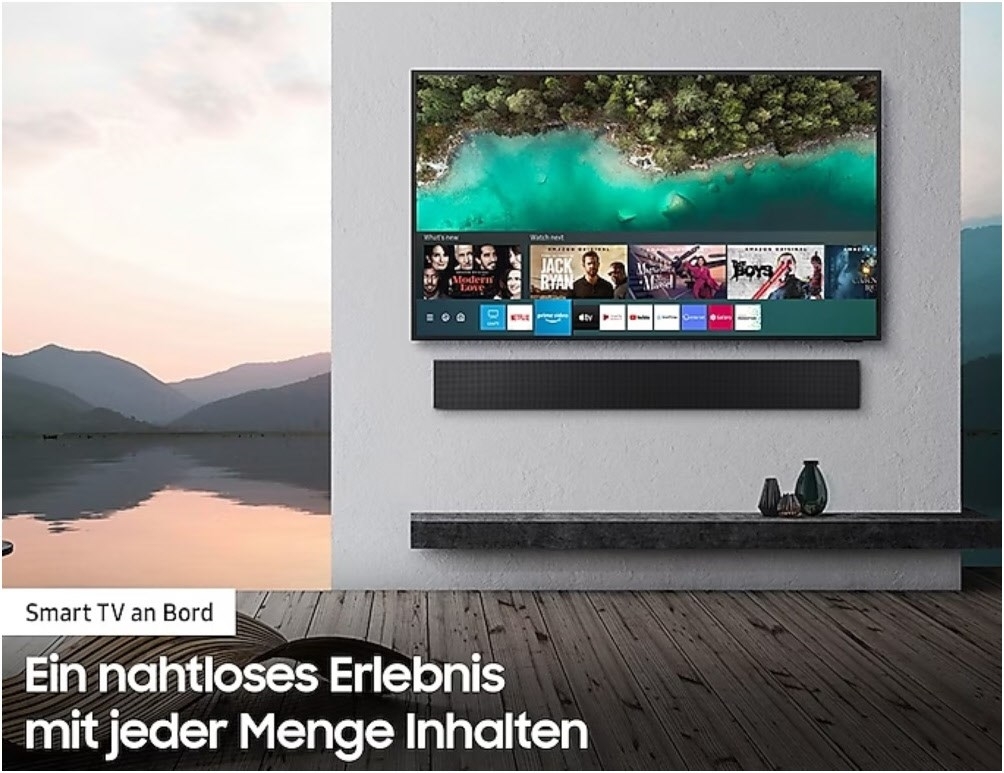 * Smart Services und grafische Benutzeroberfläche (GUI) können je nach Modell, Region, Sprache und Mobilgerät variieren. Für die Installation des TV-Gerätes ist ein Samsung Account erforderlich. Funktionen im Zusammenhang mit verbundenen Geräten können variieren.