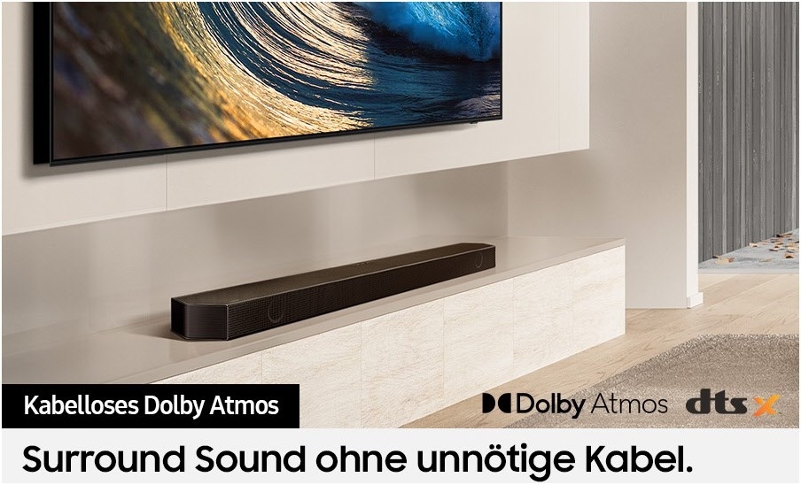 Samsung Soundbars unterstützen die objektbasierte Audiotechnologie Dolby Atmos® kabellos, d. h., ohne dass ein Kabel oder zusätzlicher Dongle angeschlossen werden muss. Erlebe somit beeindruckenden Surround Sound von Filmen und Musik ganz einfach über dein WLAN und freu dich über den aufgeräumten Look in deinem Heimkino.*