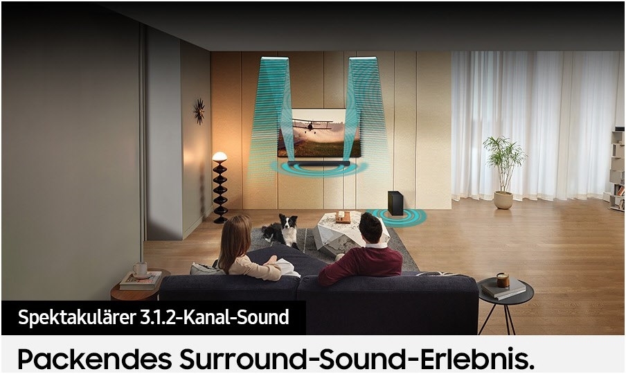 Dank dreier Kanäle, eines Subwoofers und zweier nach oben abstrahlender Kanäle lässt der 3.1.2-Kanal-Sound ein spektakuläres Akustikerlebnis entstehen.