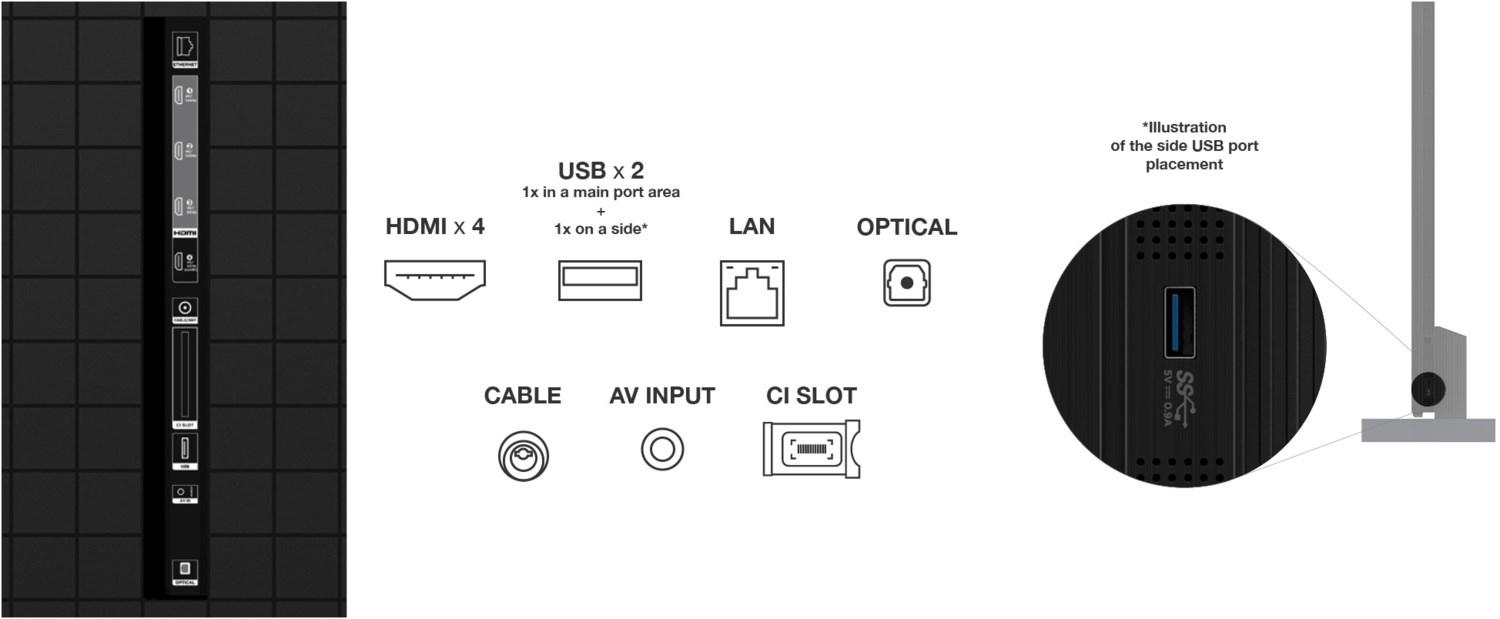 - DVB-T2/-C/-S2 Tuner, 4x HDMI 2.1, 1x USB 3.0, CI+, Digitaler Audioausgang (optisch), Ethernet (LAN), Wi-Fi & Bluetooth integriert